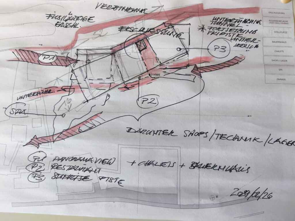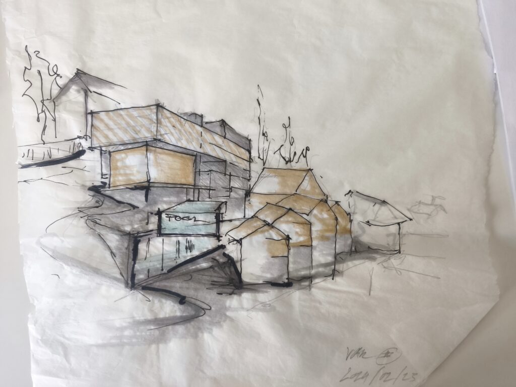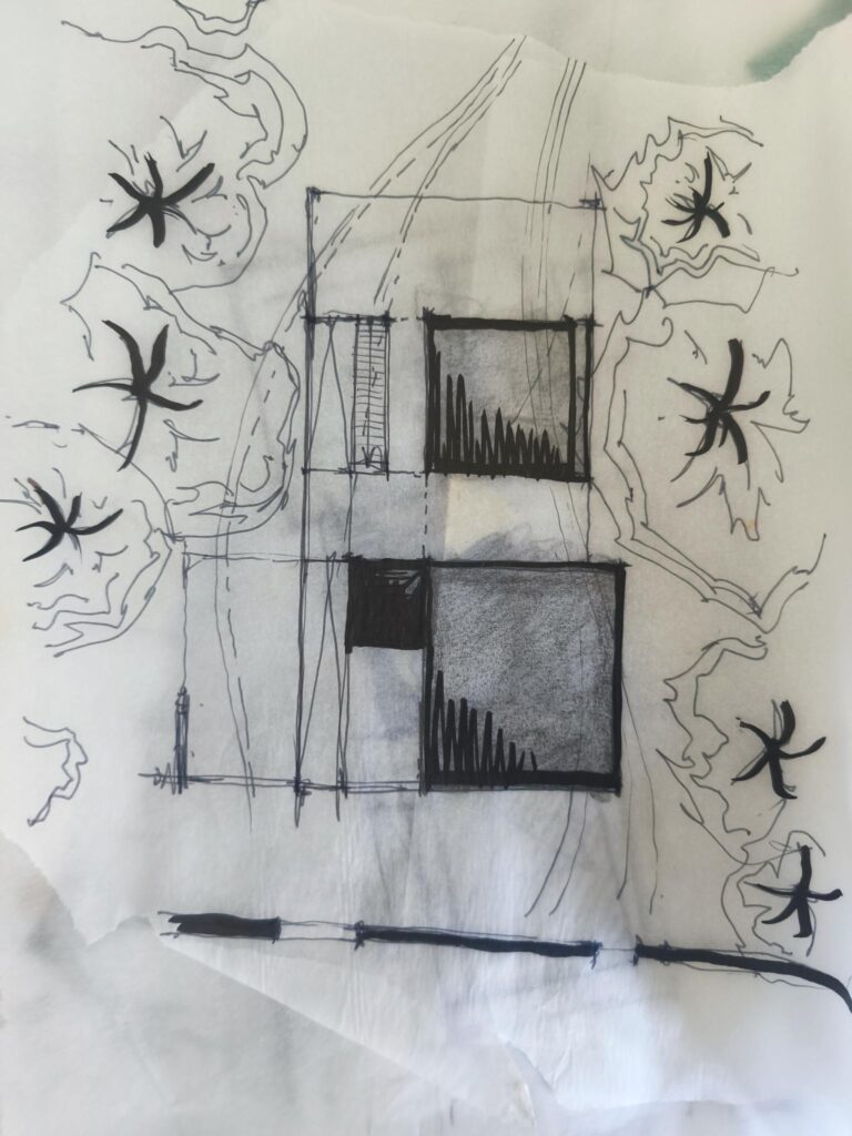 This exciting project aims to create a sustainable, low-tech building that emphasizes regional natural resources and reuse material. Designed as an educational space for everyone. The structure celebrates biodiversity and environmental harmony. The concept focuses on blending seamlessly with the natural and built landscape, promoting ecological awareness and regional craftsmanship. By utilizing local materials – sourced and new – and low-impact construction techniques, the project embodies a commitment to ecological preservation, regional identity, and resilient architecture. The building is planned to invite to rest, relax, recharge – with handcrafted drinks and snacks – but also learn about the process of seed, grow and harvesting what nature provides, about animals and their individual impact such as bees, worms, birds.